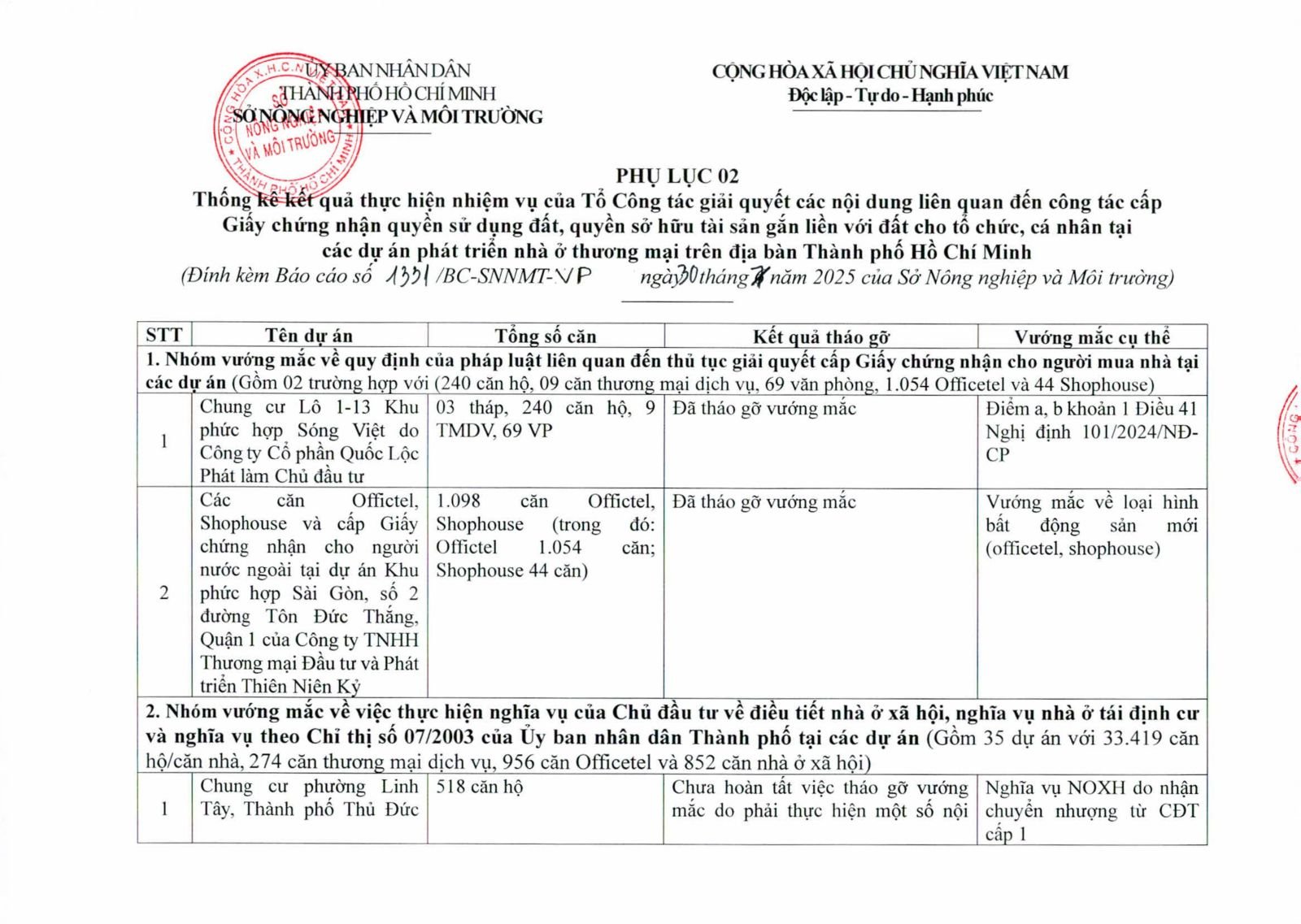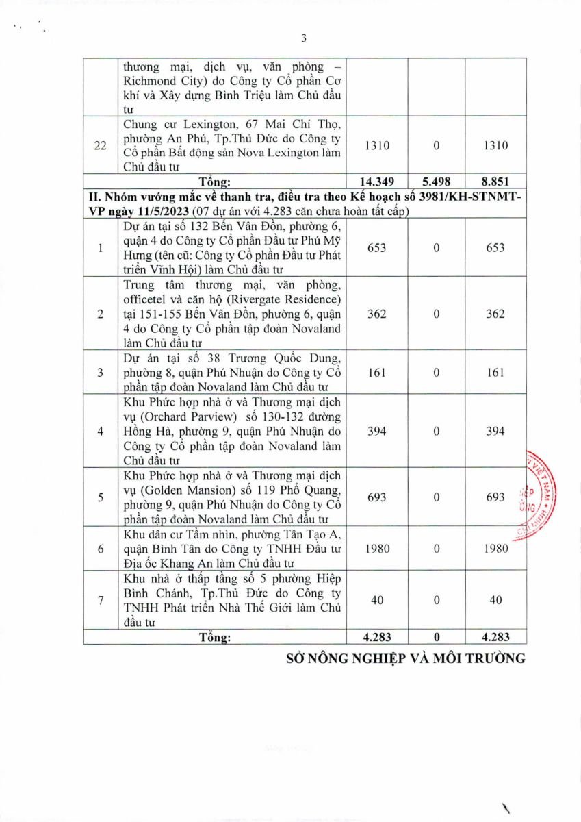 Sở Tài nguyên và Môi trường TP.HCM vừa có báo cáo gửi UBND thành phố về tình trạng cấp giấy chứng nhận quyền sử dụng đất, quyền sở hữu nhà ở và tài sản gắn liền với đất. Báo cáo chỉ ra, bên cạnh kết quả đạt được, hàng loạt dự án nhà ở thương mại vẫn còn vướng mắc trong khâu pháp lý, khiến người dân chưa được cấp sổ hồng.