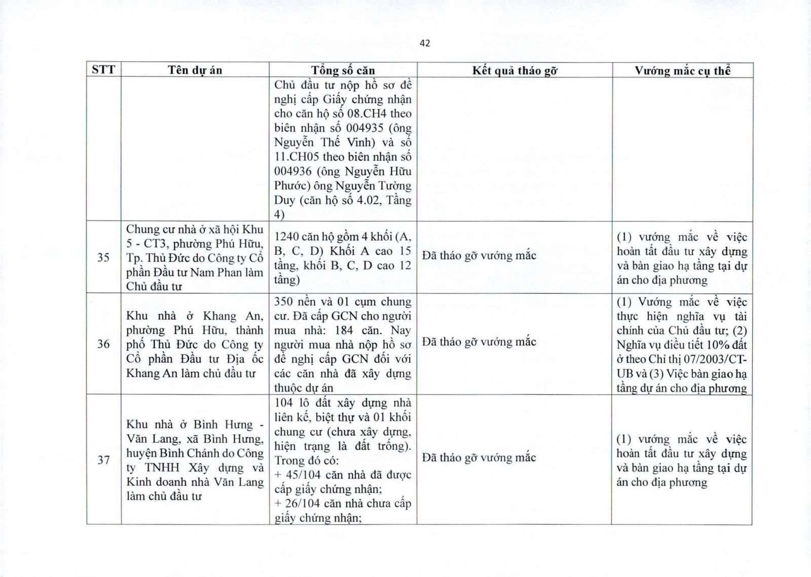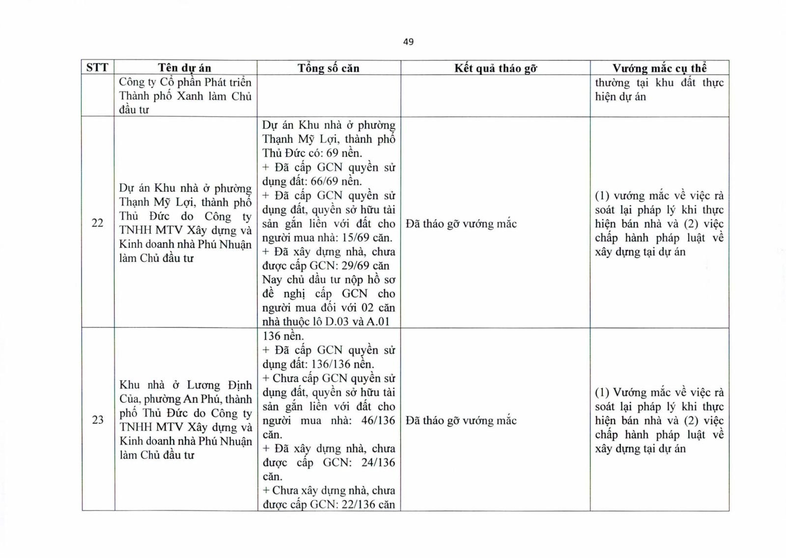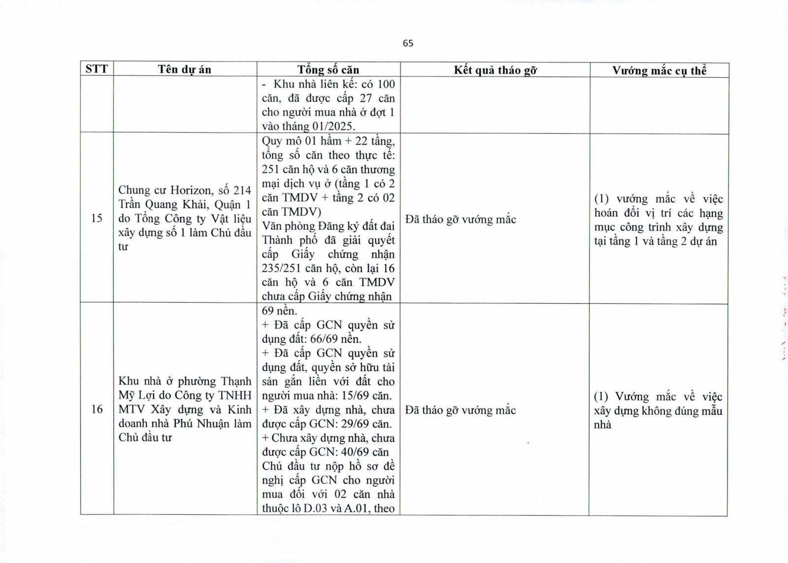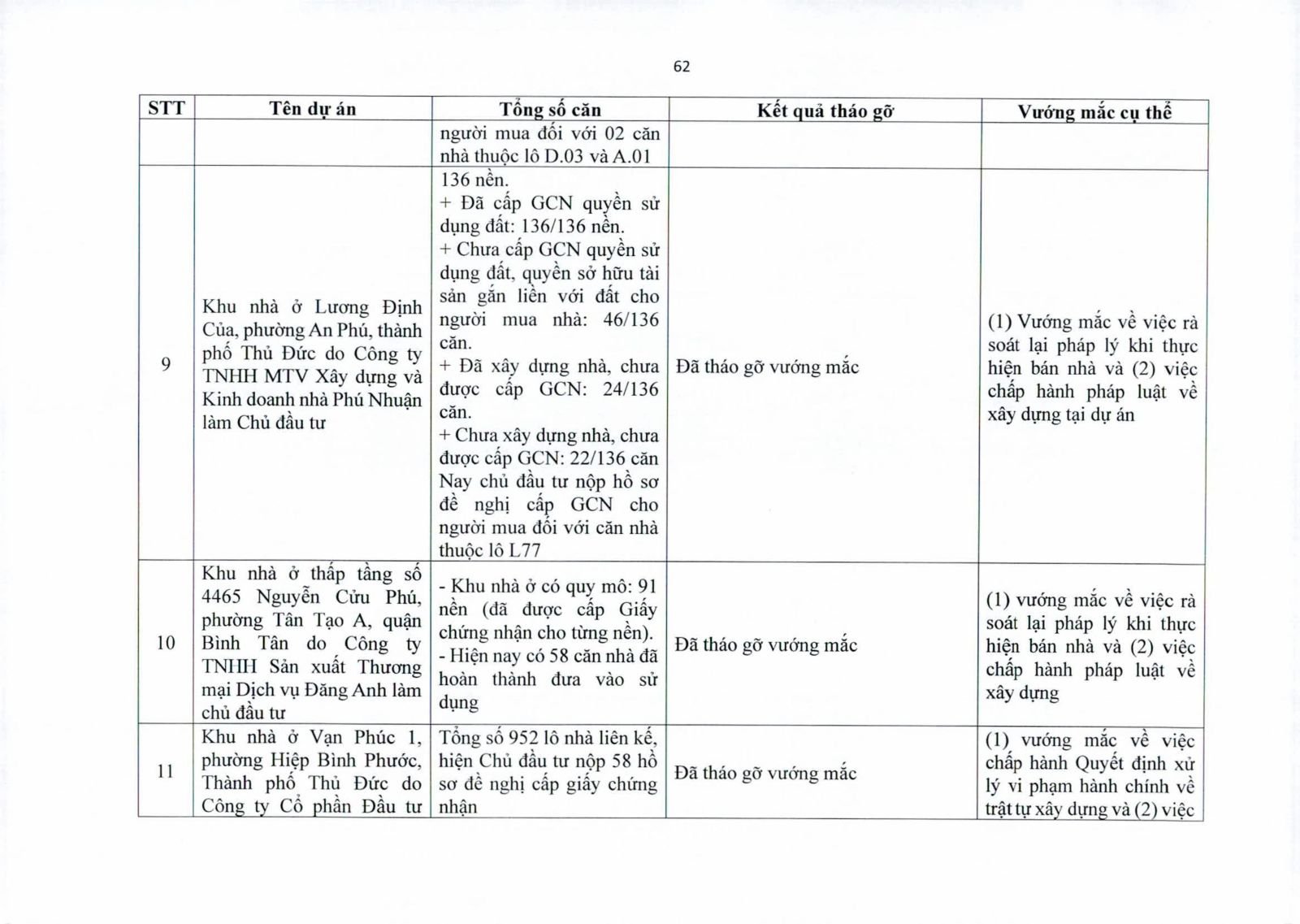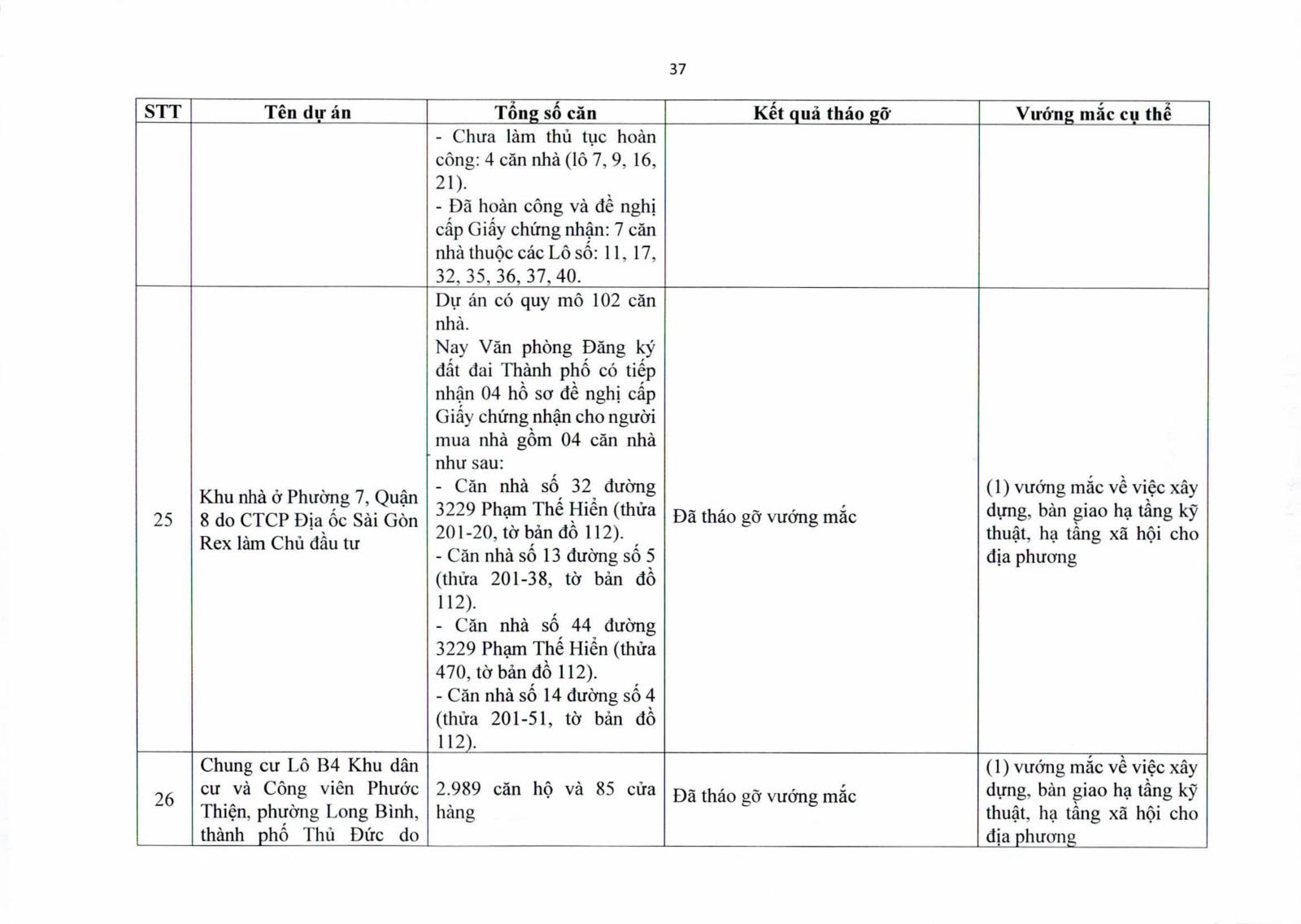 Nhiều dự án đã bàn giao nhà cho khách hàng nhưng tiến độ cấp giấy chứng nhận bị đình trệ do chủ đầu tư chưa hoàn tất nghĩa vụ tài chính hoặc còn vướng thủ tục đất đai. Một số dự án lớn tại các quận 2 (cũ), quận 7, Bình Thạnh, Tân Phú, Bình Tân… nằm trong diện này.