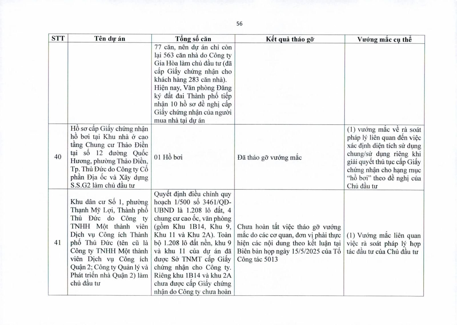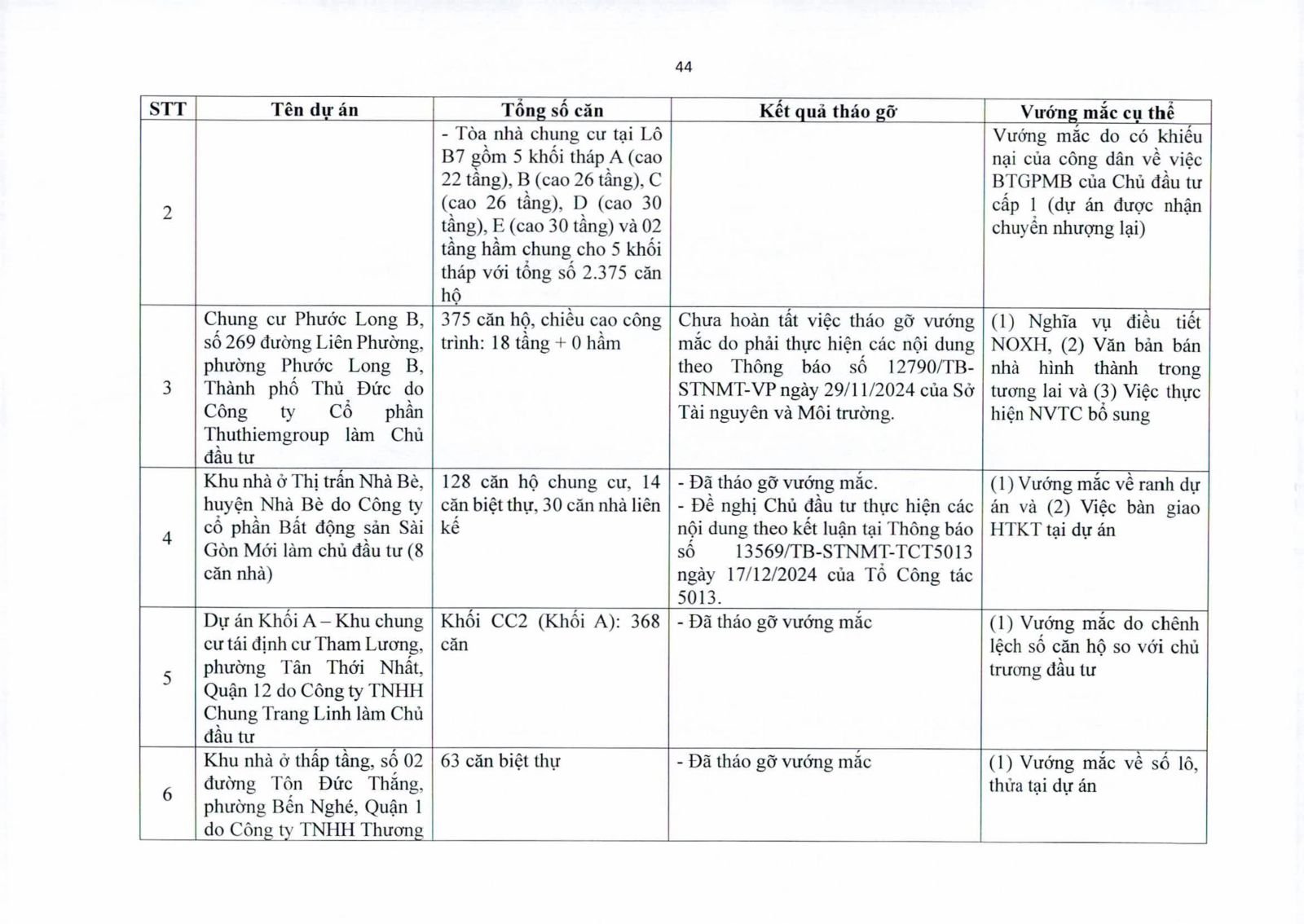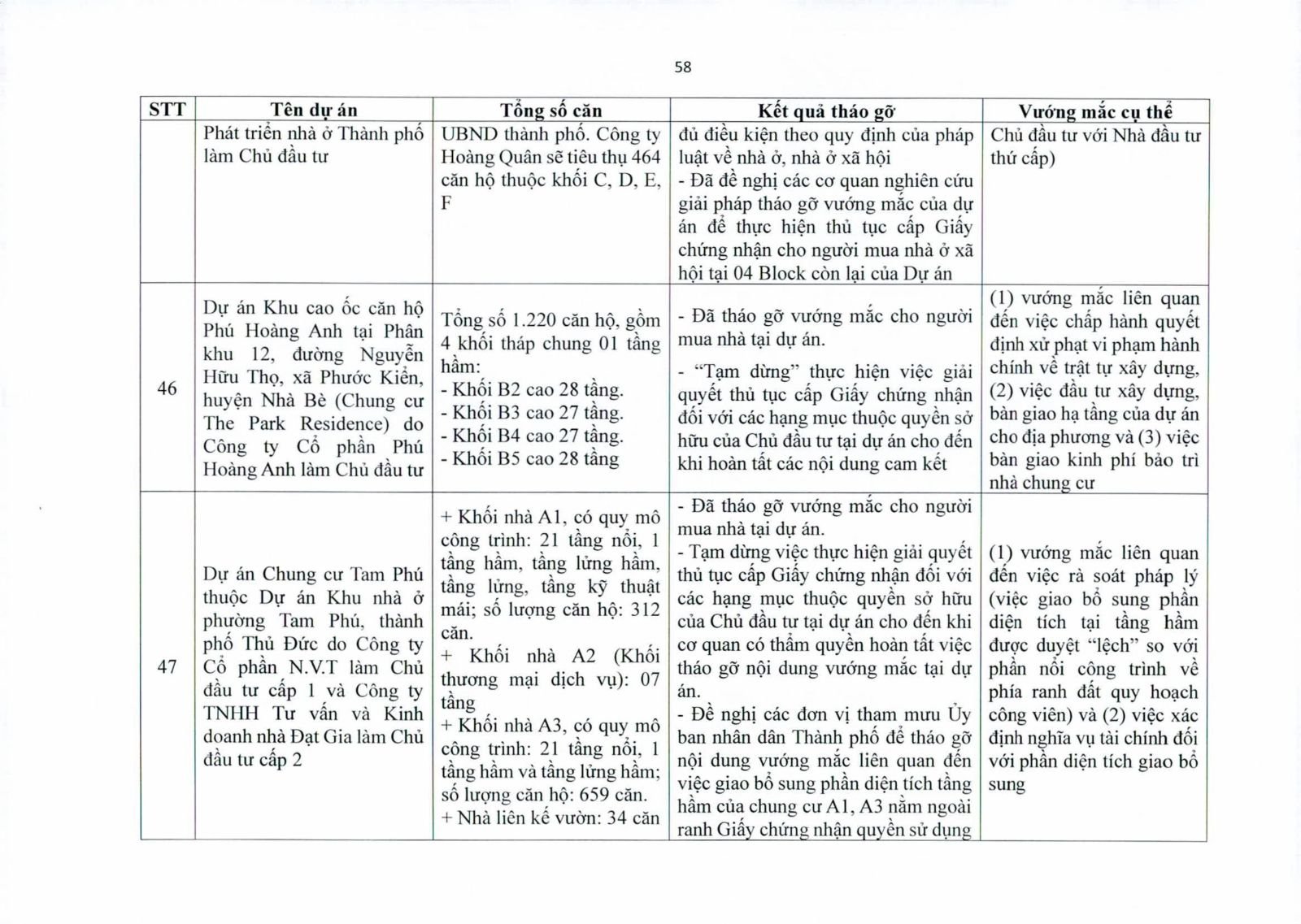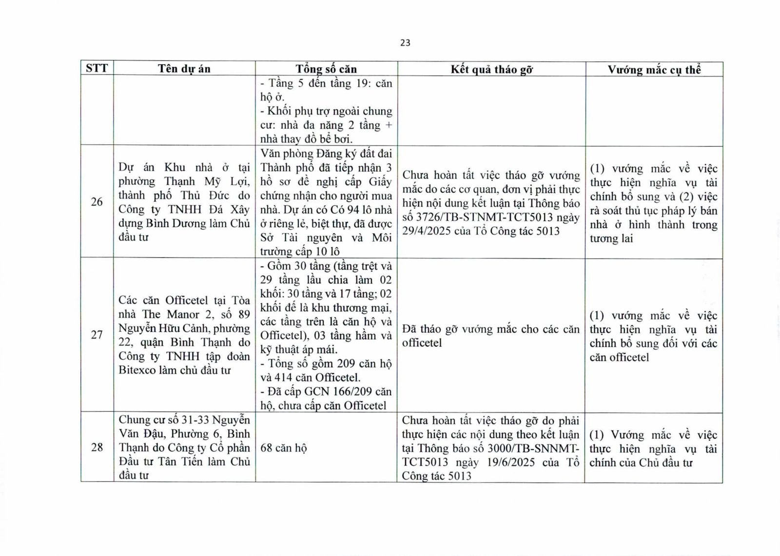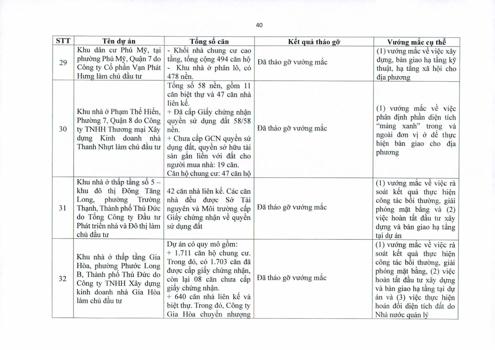 Nhiều dự án đã bàn giao nhà cho khách hàng nhưng tiến độ cấp giấy chứng nhận bị đình trệ do chủ đầu tư chưa hoàn tất nghĩa vụ tài chính hoặc còn vướng thủ tục đất đai. Một số dự án lớn tại các quận 2 (cũ), quận 7, Bình Thạnh, Tân Phú, Bình Tân… nằm trong diện này.