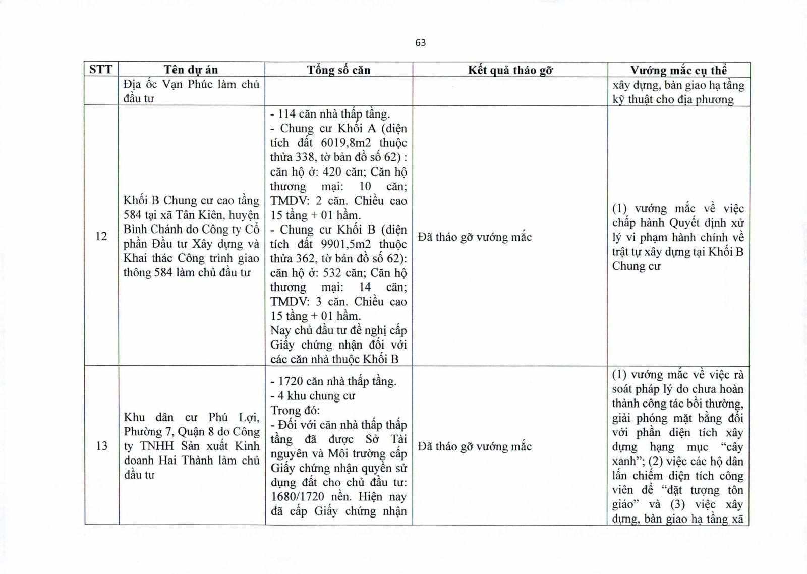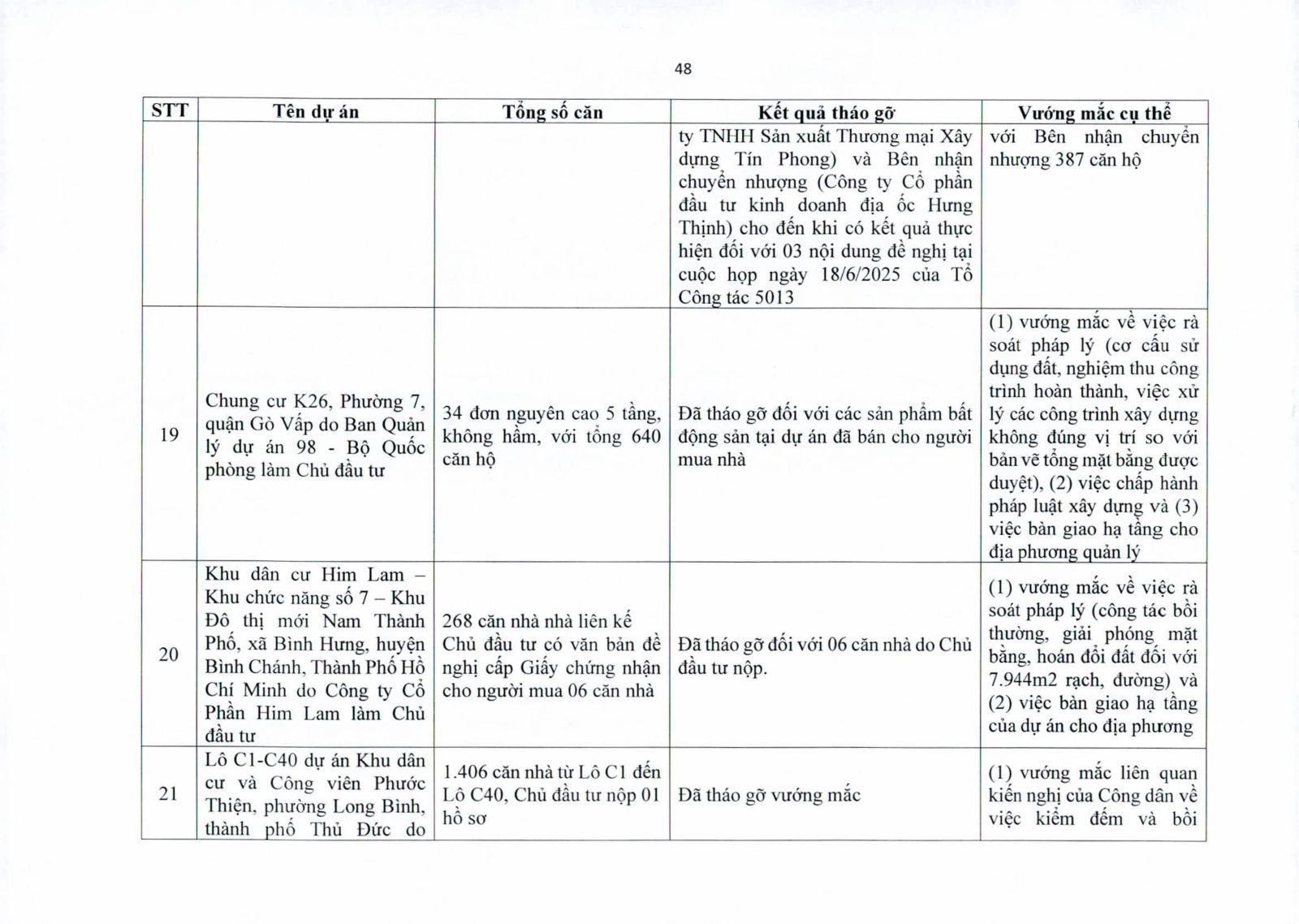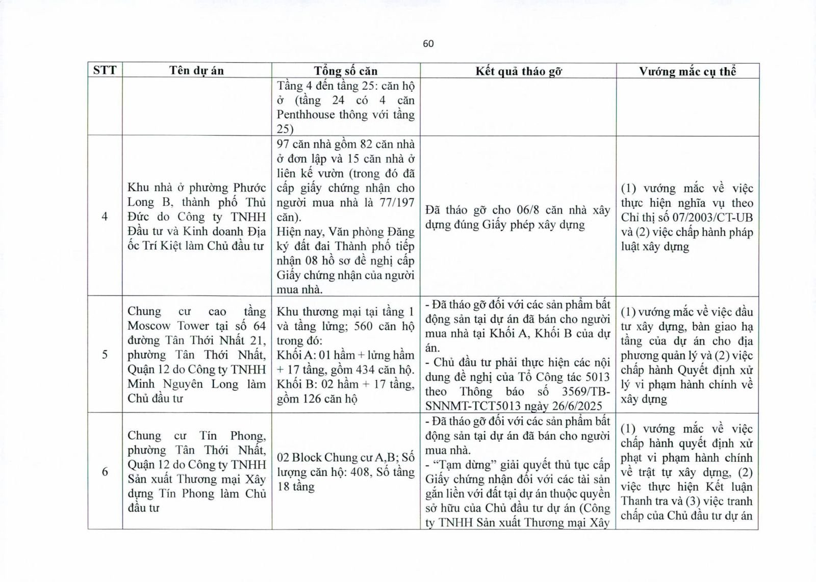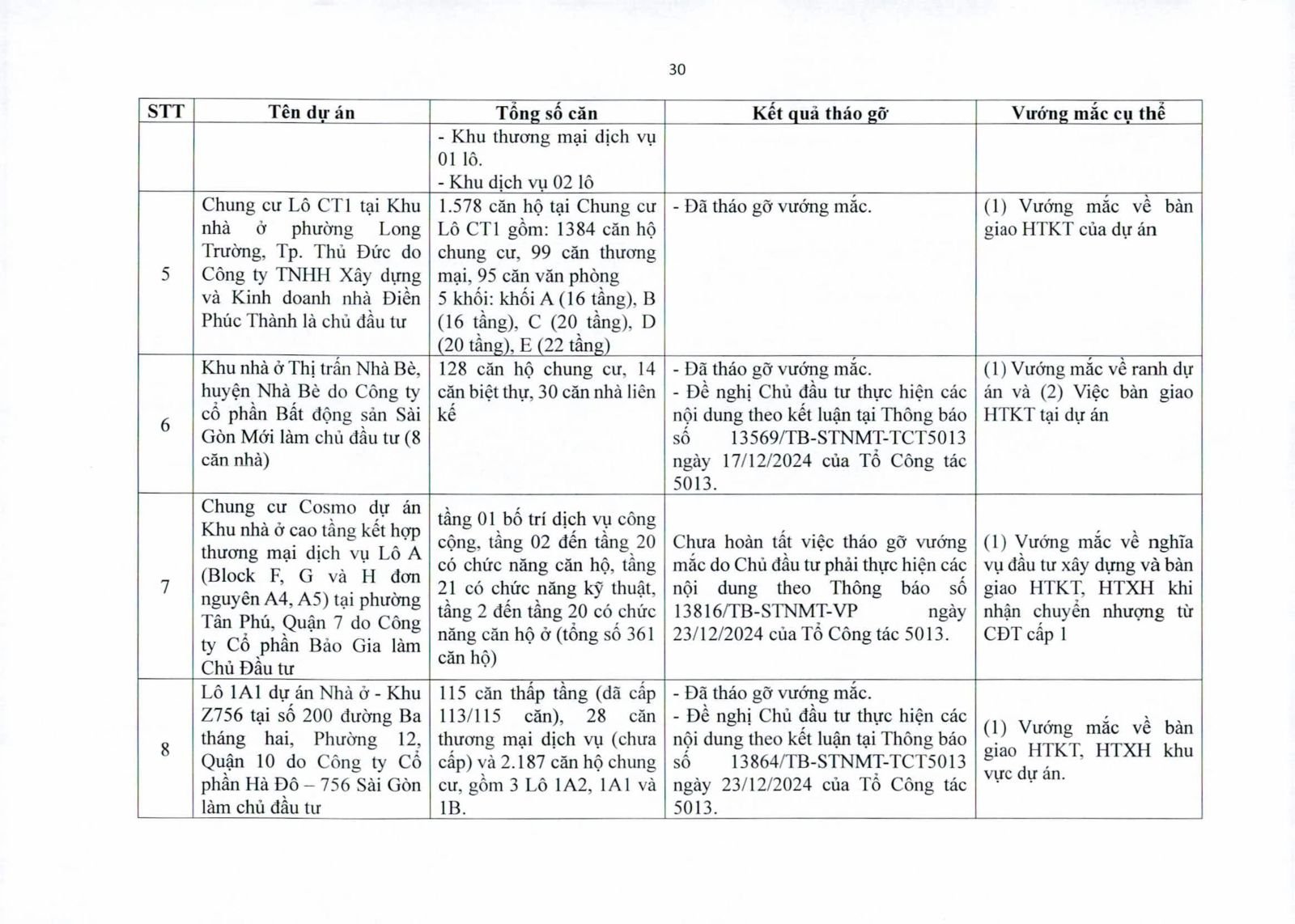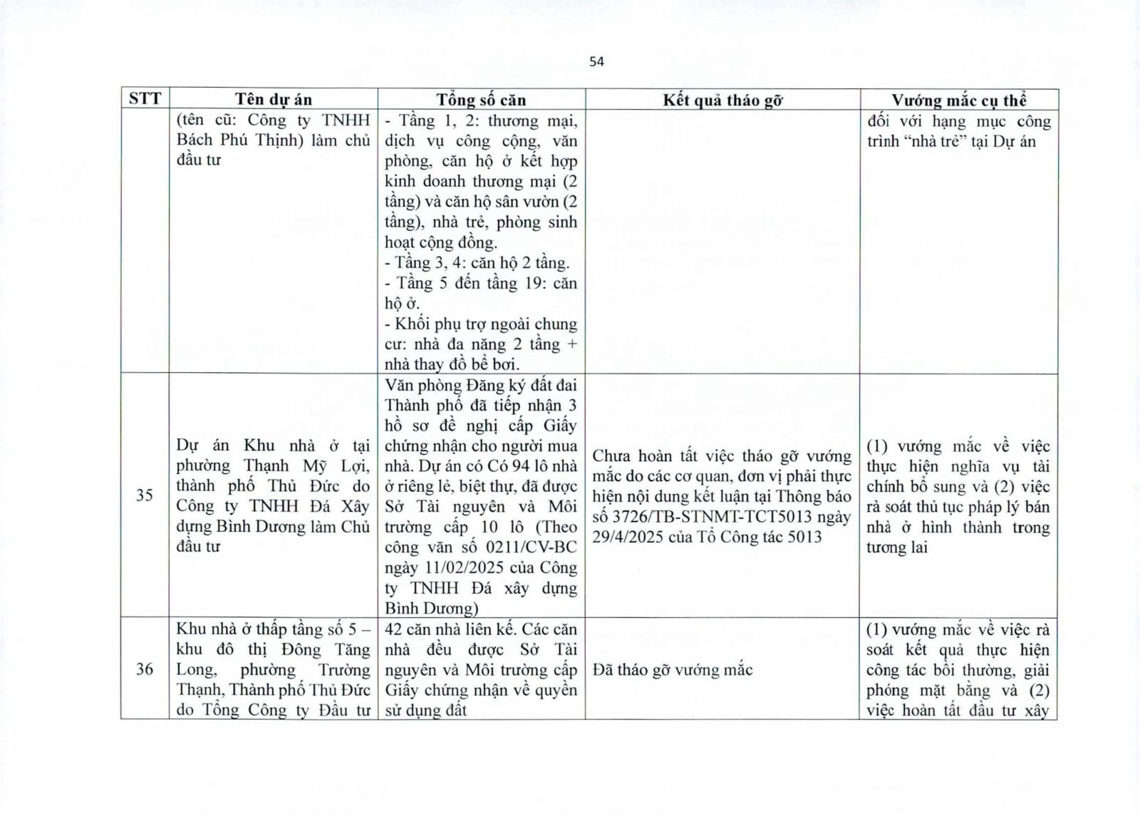 Nhiều dự án đã bàn giao nhà cho khách hàng nhưng tiến độ cấp giấy chứng nhận bị đình trệ do chủ đầu tư chưa hoàn tất nghĩa vụ tài chính hoặc còn vướng thủ tục đất đai. Một số dự án lớn tại các quận 2 (cũ), quận 7, Bình Thạnh, Tân Phú, Bình Tân… nằm trong diện này.