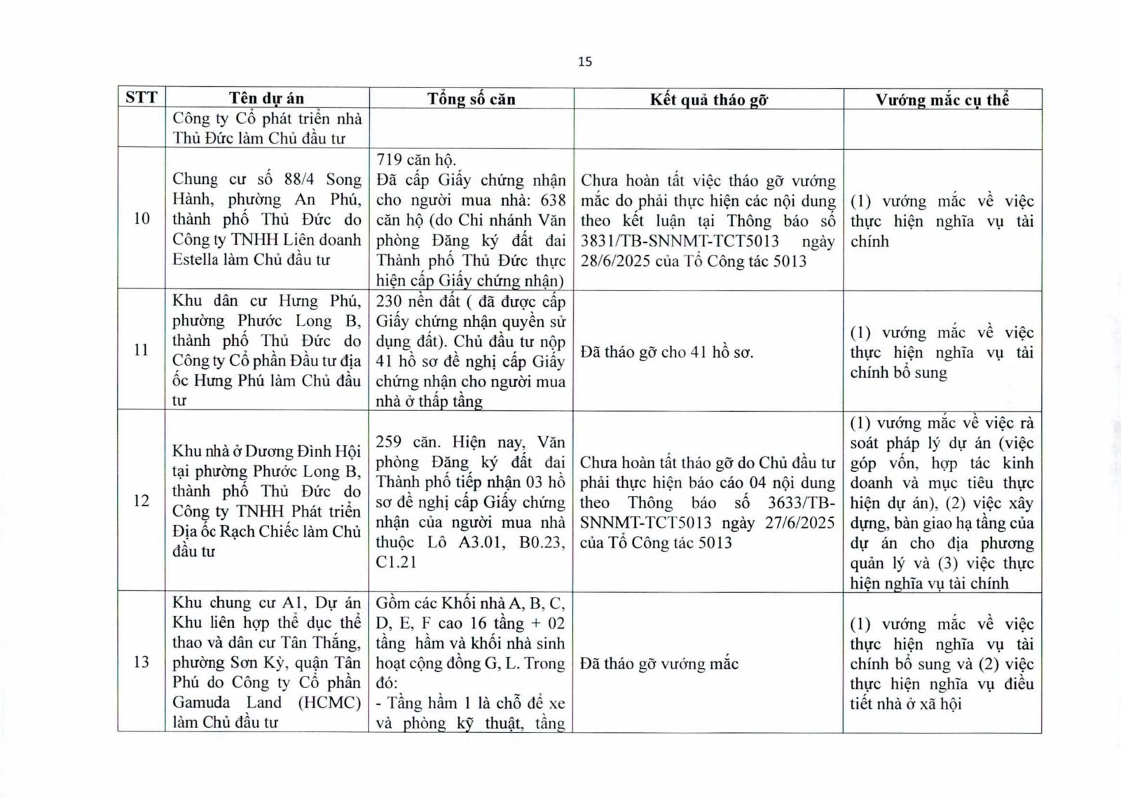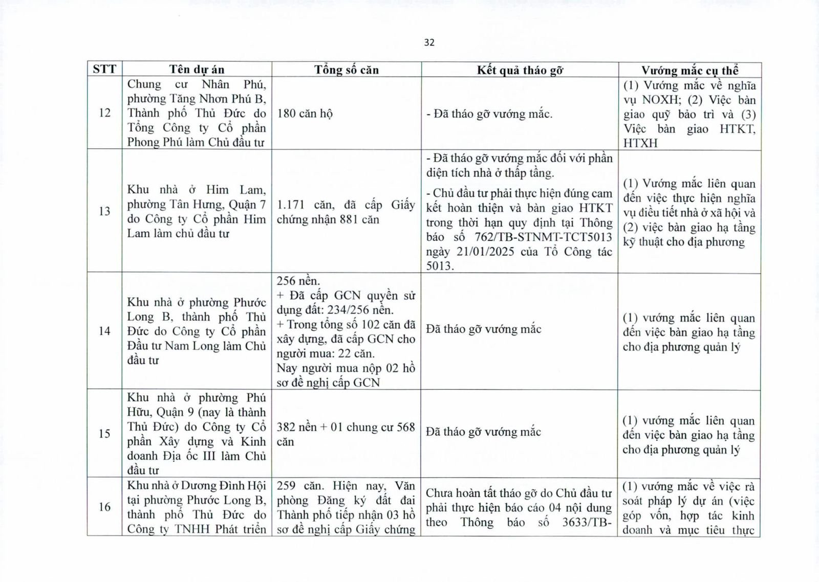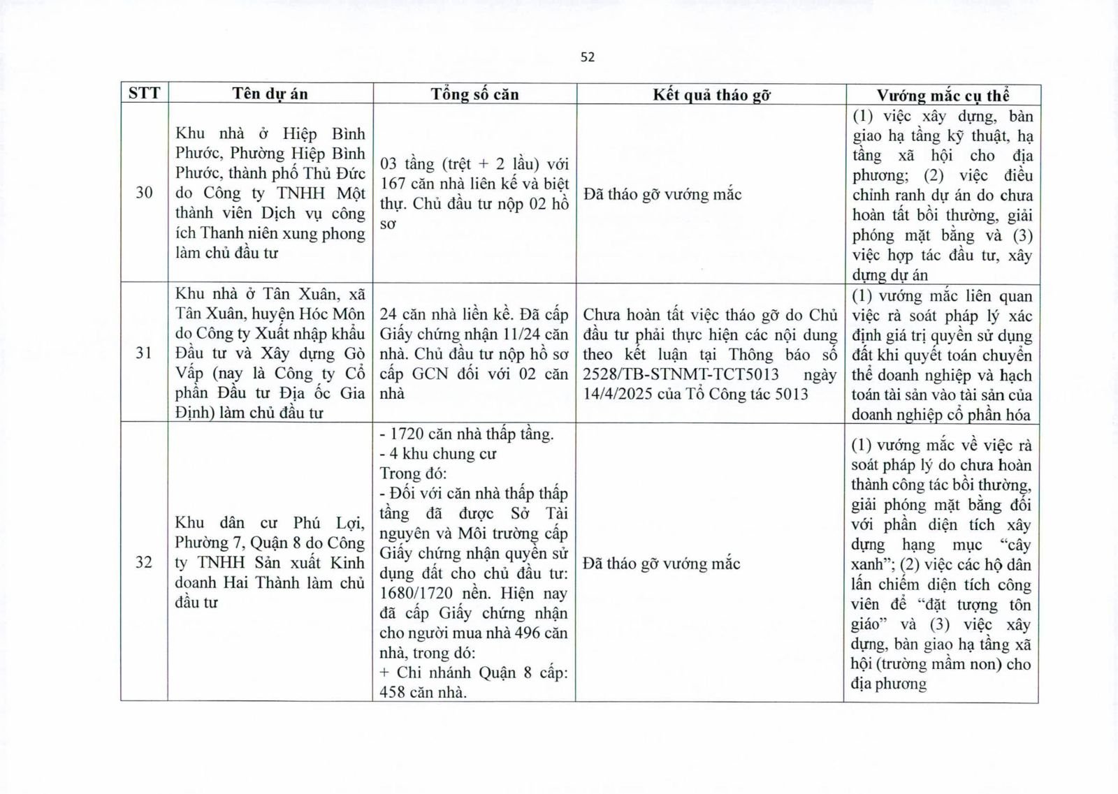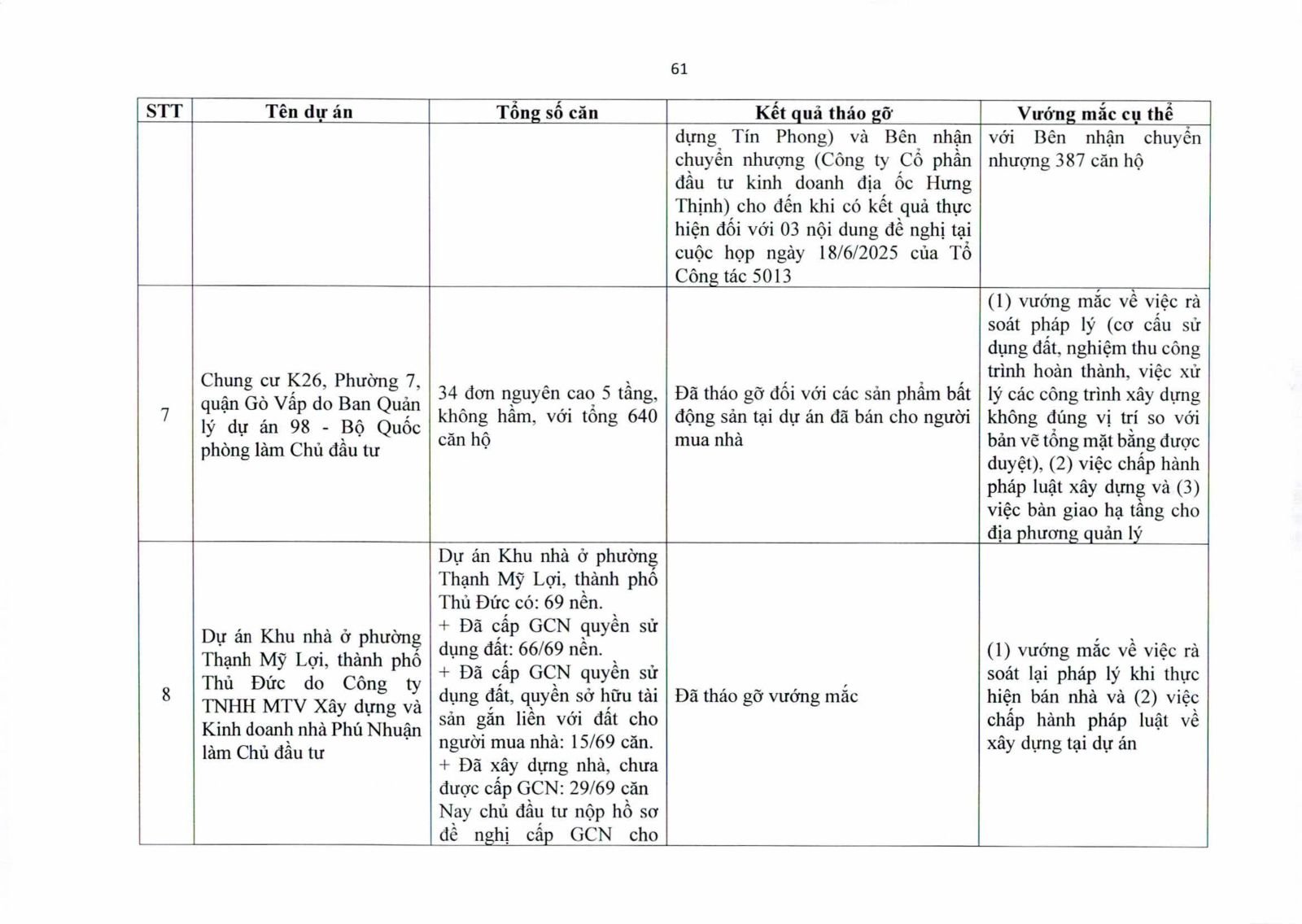 Nhiều dự án đã bàn giao nhà cho khách hàng nhưng tiến độ cấp giấy chứng nhận bị đình trệ do chủ đầu tư chưa hoàn tất nghĩa vụ tài chính hoặc còn vướng thủ tục đất đai. Một số dự án lớn tại các quận 2 (cũ), quận 7, Bình Thạnh, Tân Phú, Bình Tân… nằm trong diện này.