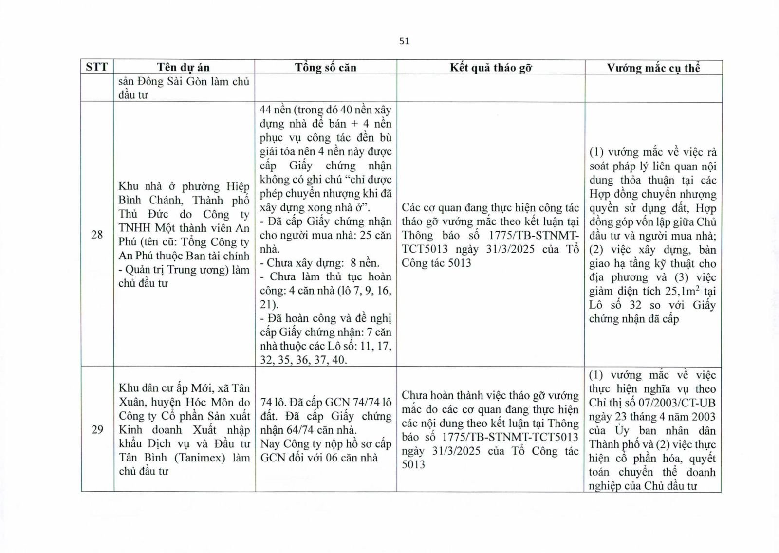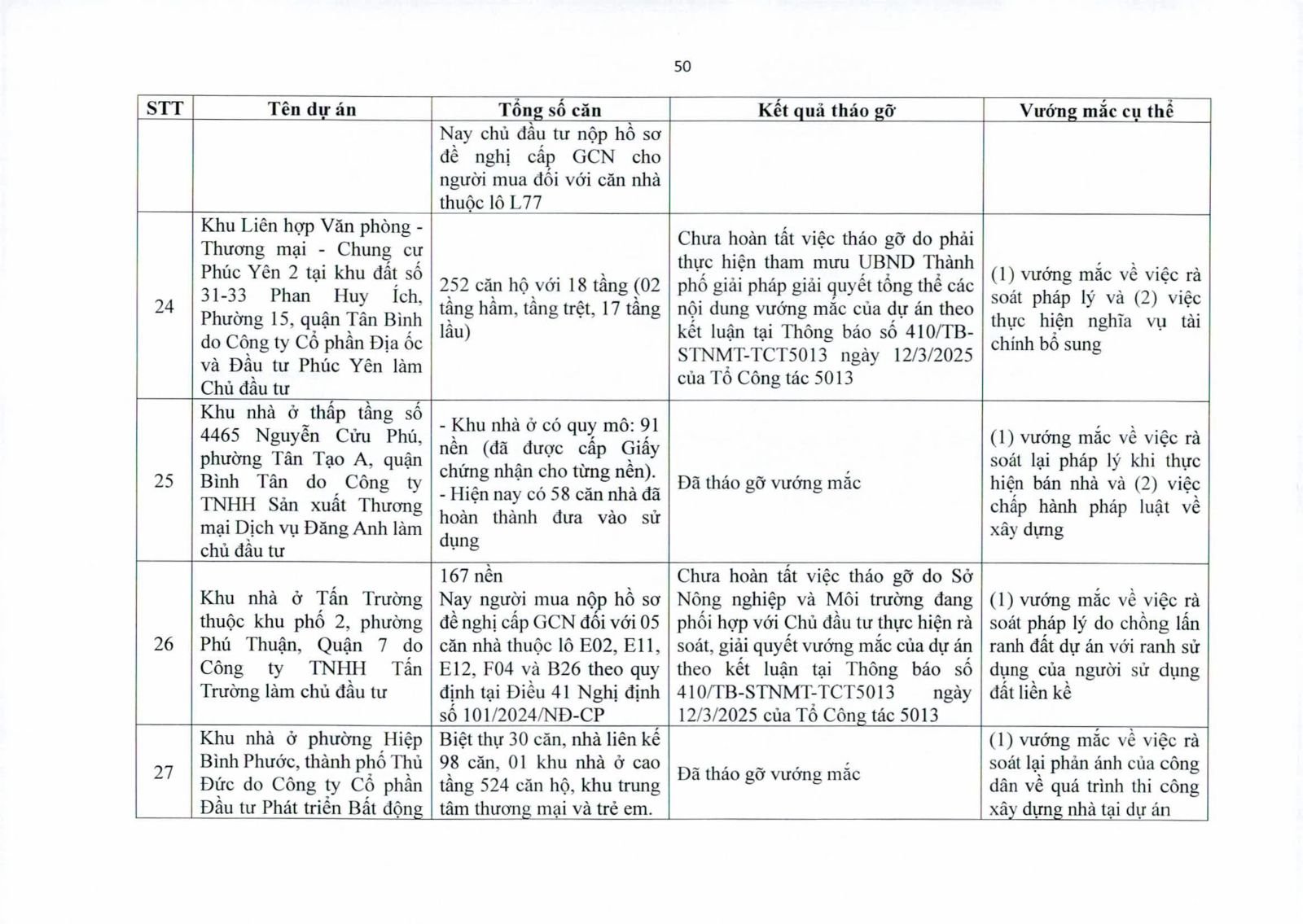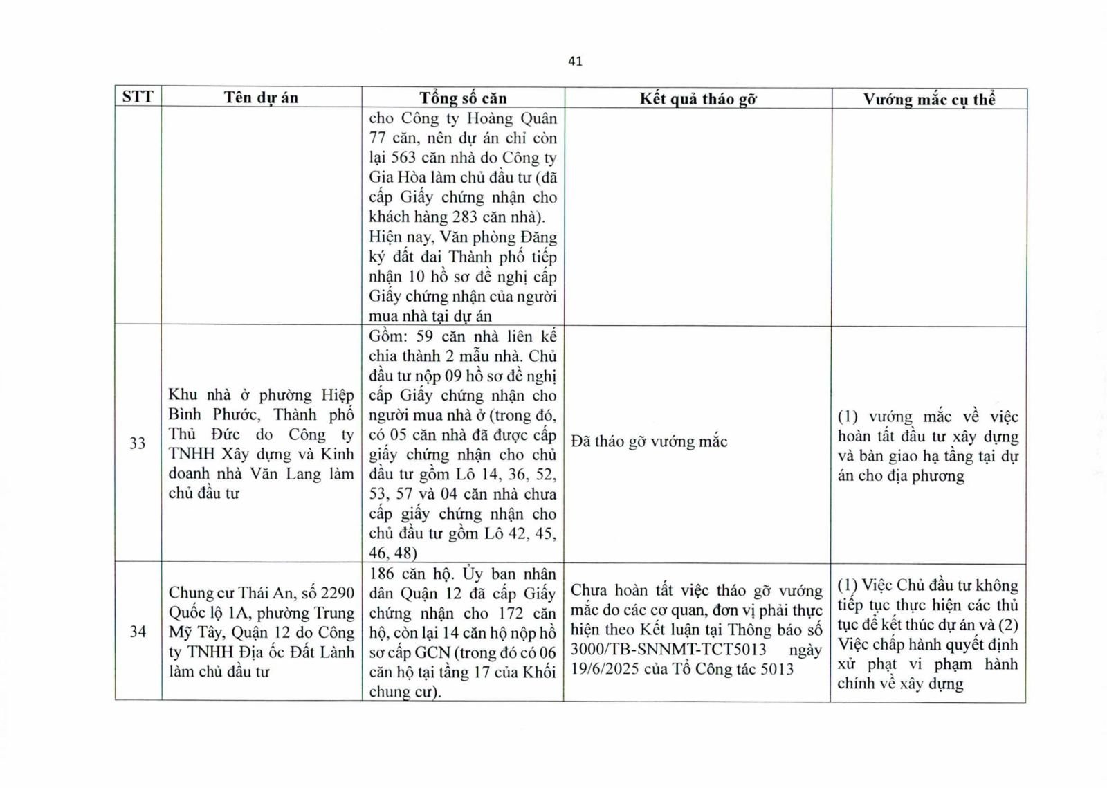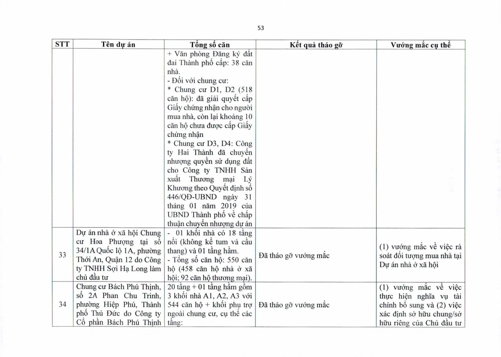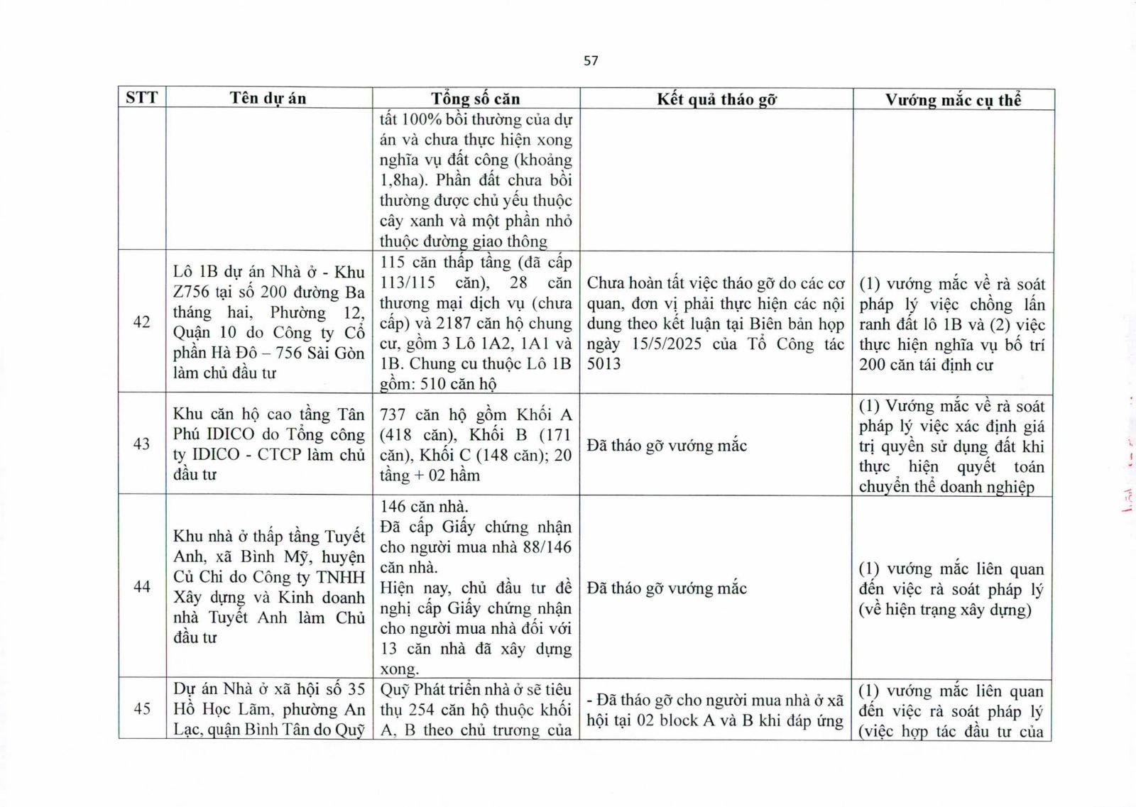 Nhiều dự án đã bàn giao nhà cho khách hàng nhưng tiến độ cấp giấy chứng nhận bị đình trệ do chủ đầu tư chưa hoàn tất nghĩa vụ tài chính hoặc còn vướng thủ tục đất đai. Một số dự án lớn tại các quận 2 (cũ), quận 7, Bình Thạnh, Tân Phú, Bình Tân… nằm trong diện này.