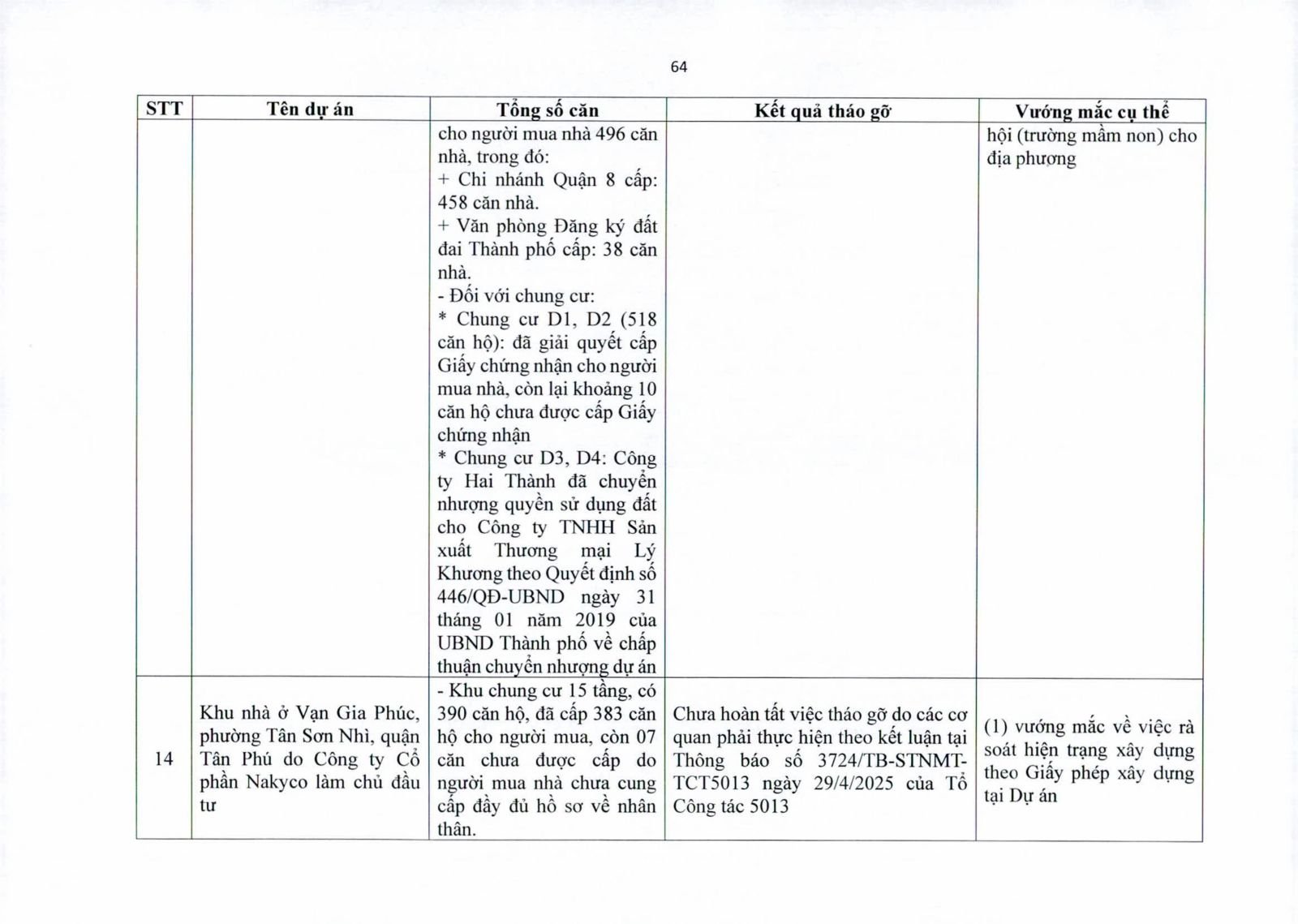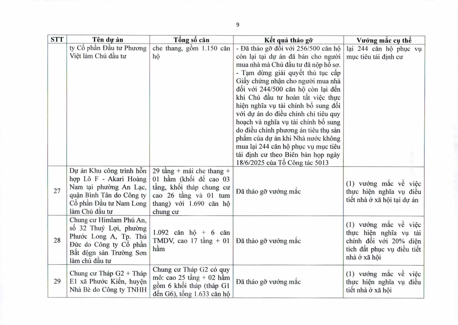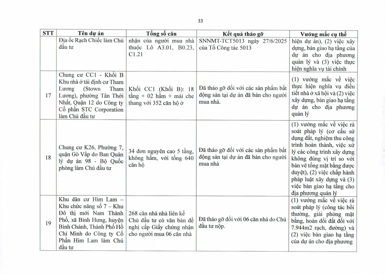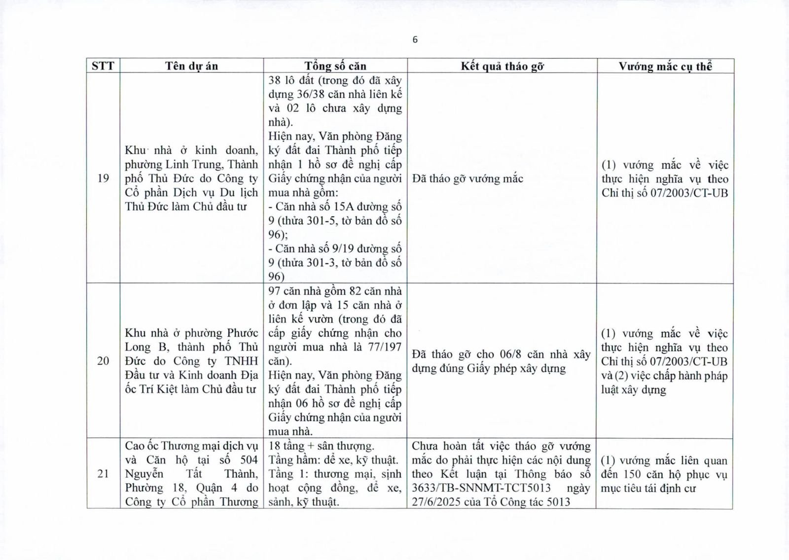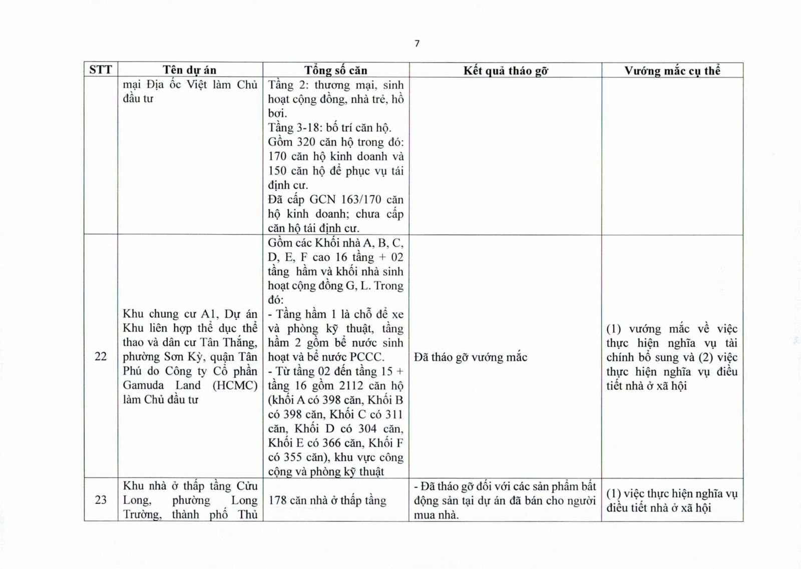 Nhiều dự án đã bàn giao nhà cho khách hàng nhưng tiến độ cấp giấy chứng nhận bị đình trệ do chủ đầu tư chưa hoàn tất nghĩa vụ tài chính hoặc còn vướng thủ tục đất đai. Một số dự án lớn tại các quận 2 (cũ), quận 7, Bình Thạnh, Tân Phú, Bình Tân… nằm trong diện này.