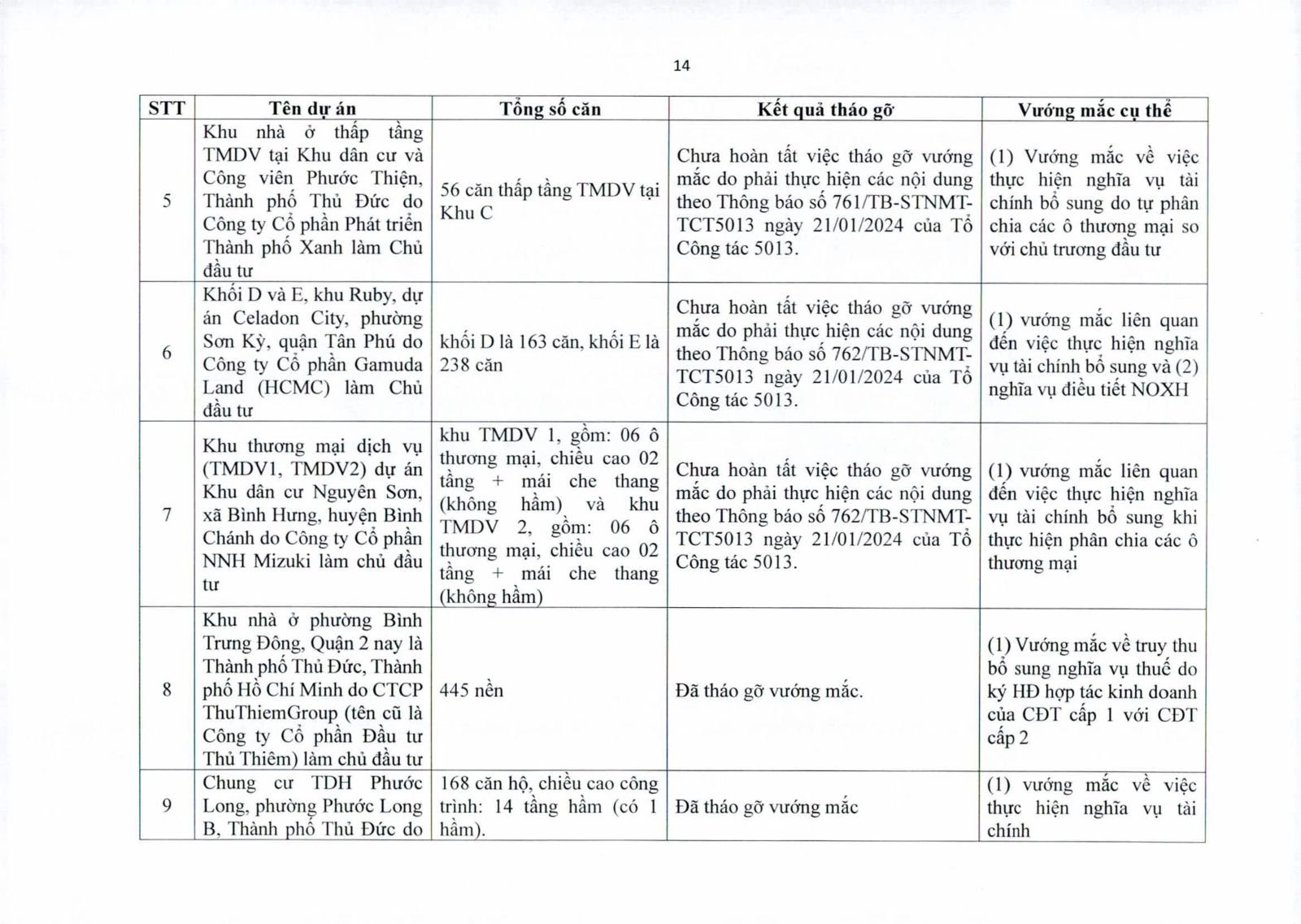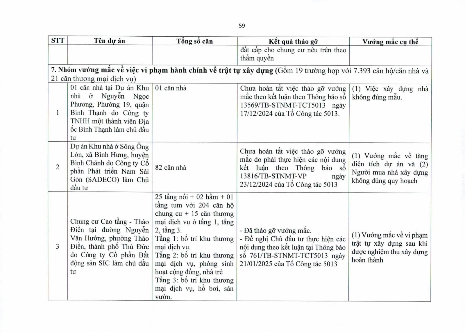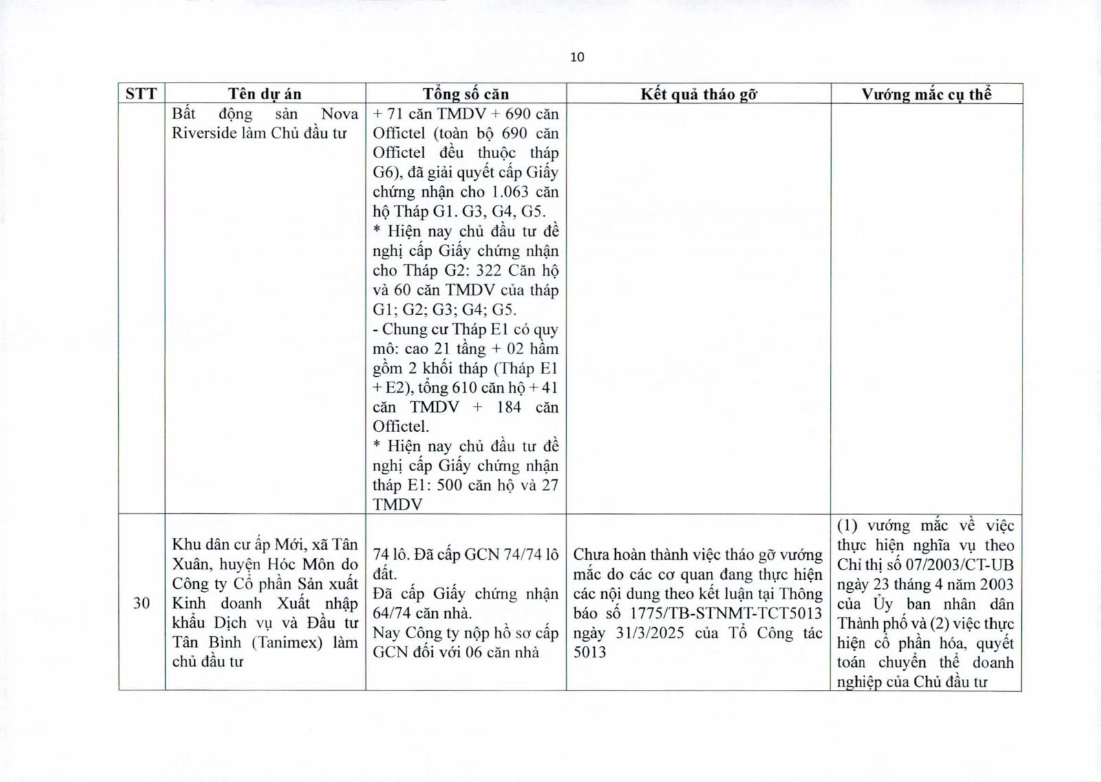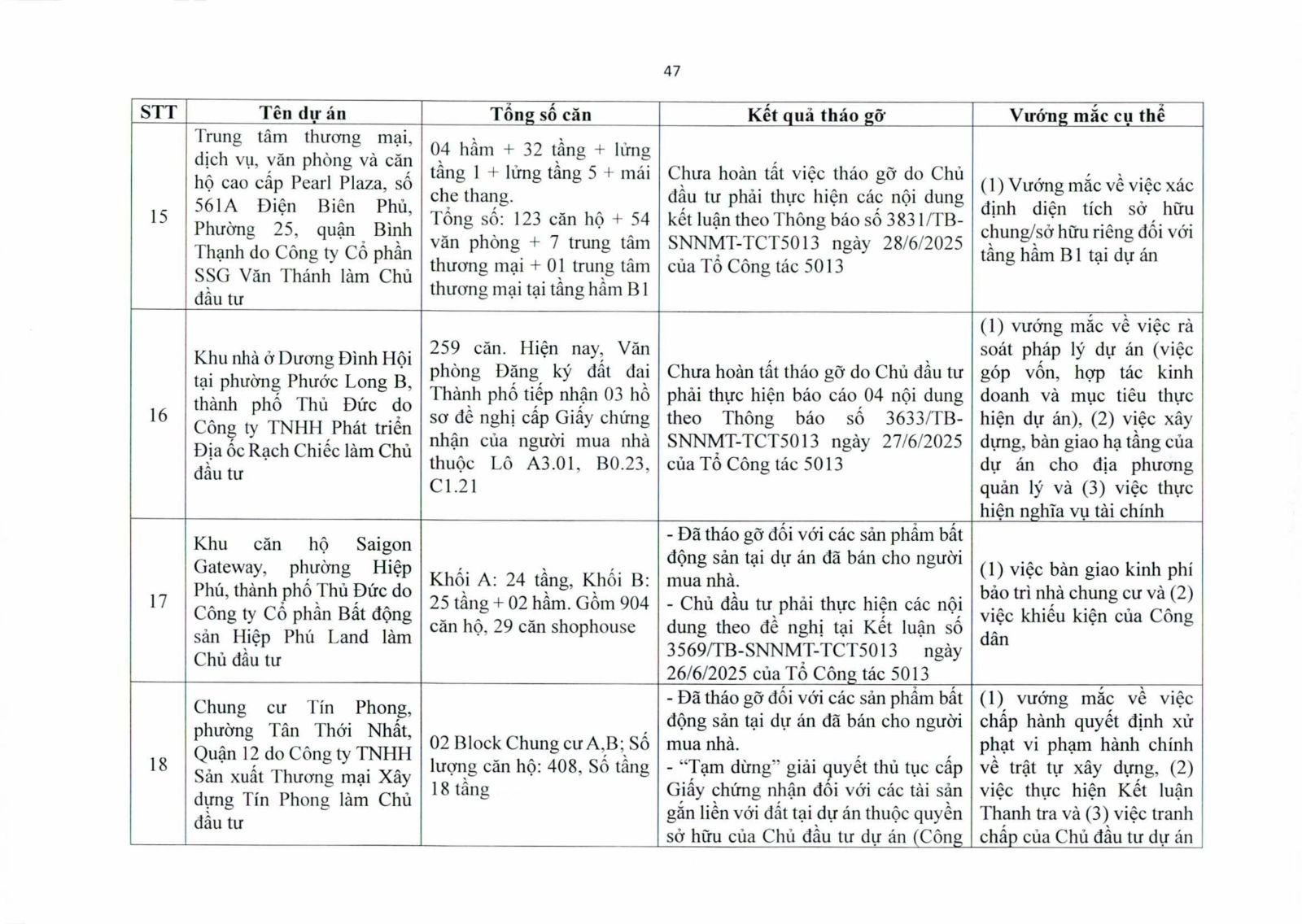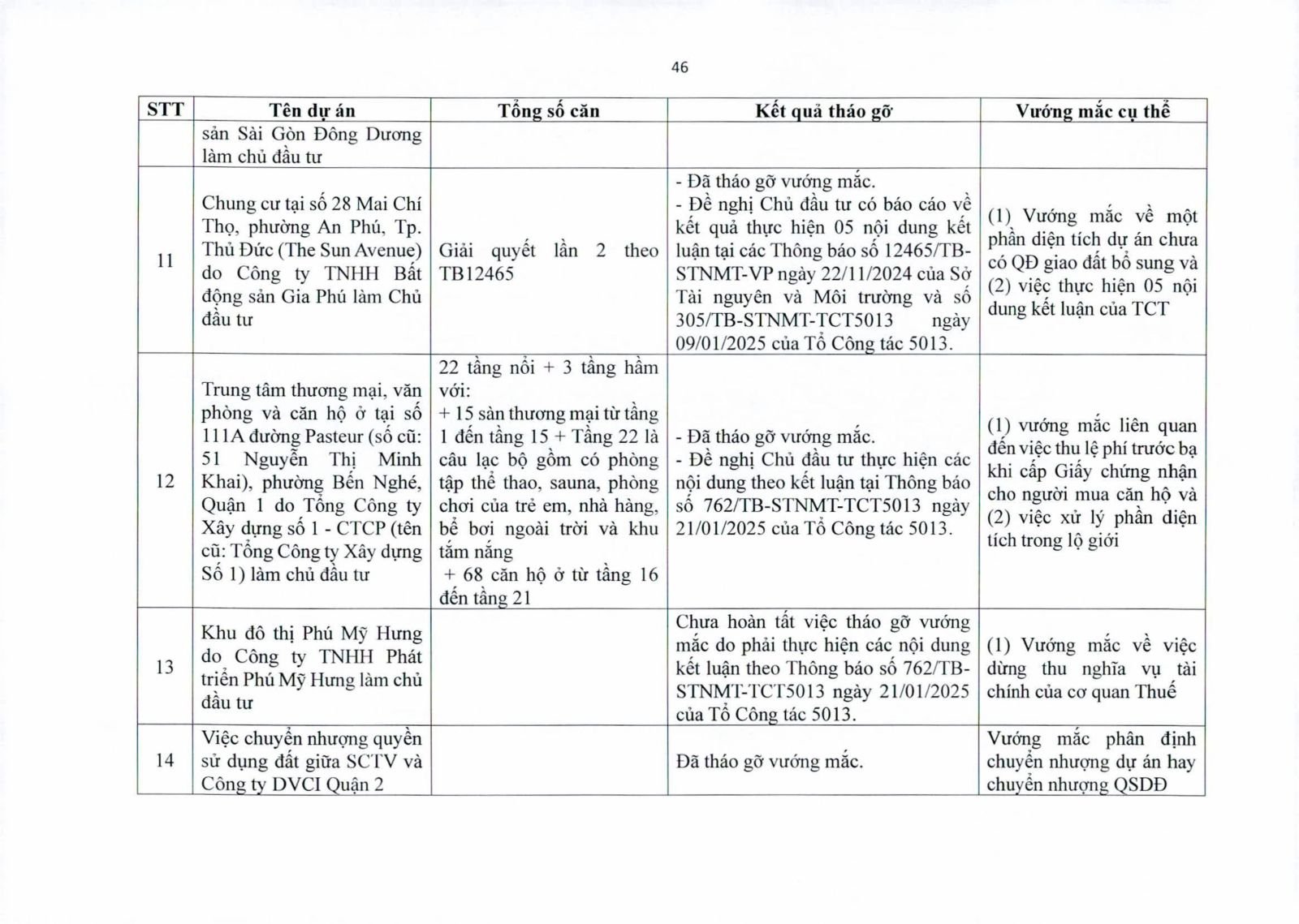 Nhiều dự án đã bàn giao nhà cho khách hàng nhưng tiến độ cấp giấy chứng nhận bị đình trệ do chủ đầu tư chưa hoàn tất nghĩa vụ tài chính hoặc còn vướng thủ tục đất đai. Một số dự án lớn tại các quận 2 (cũ), quận 7, Bình Thạnh, Tân Phú, Bình Tân… nằm trong diện này.