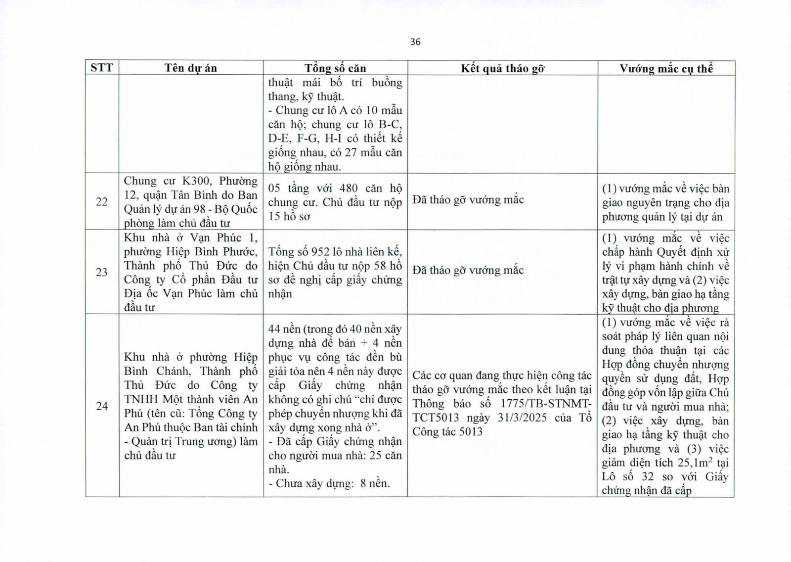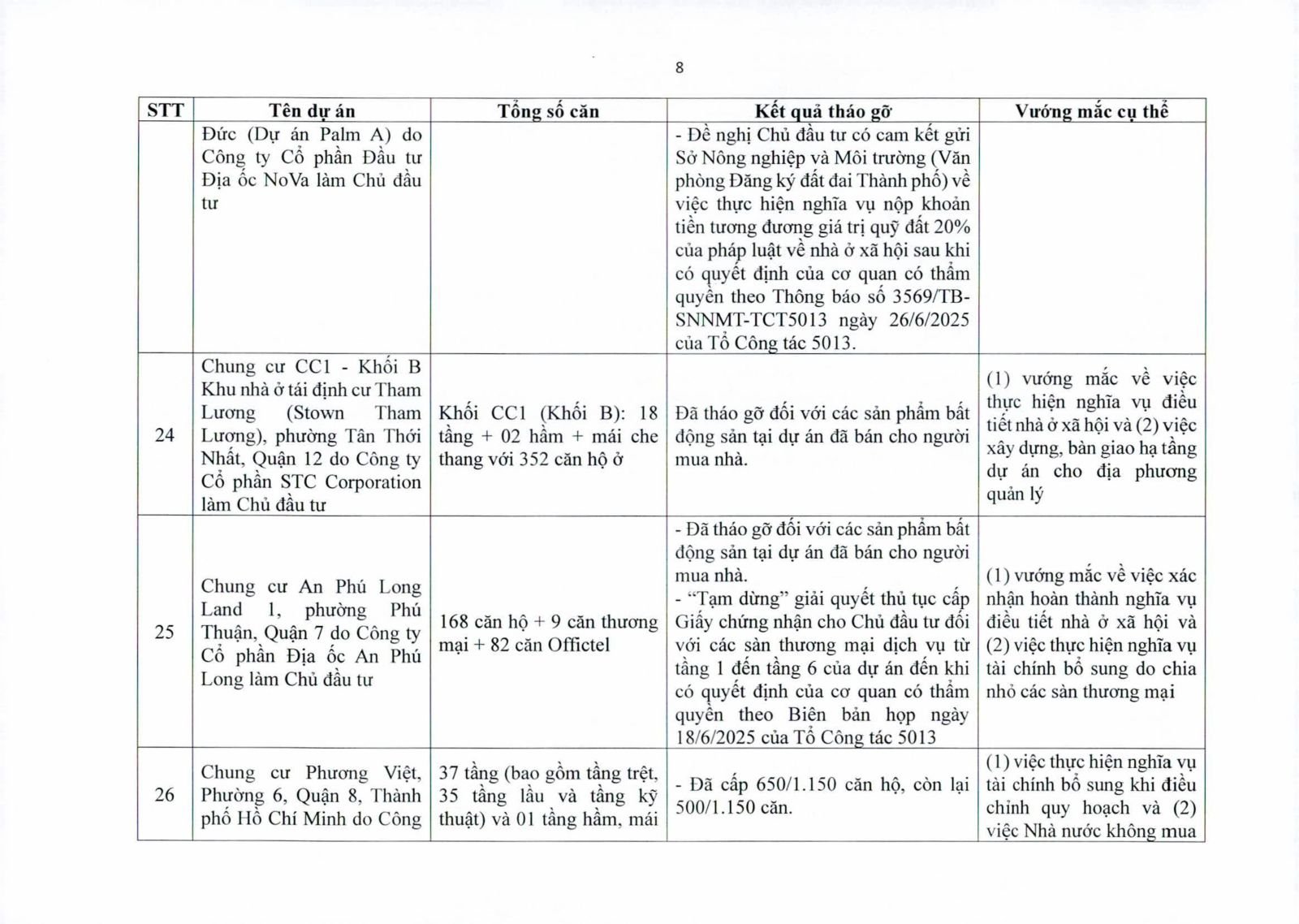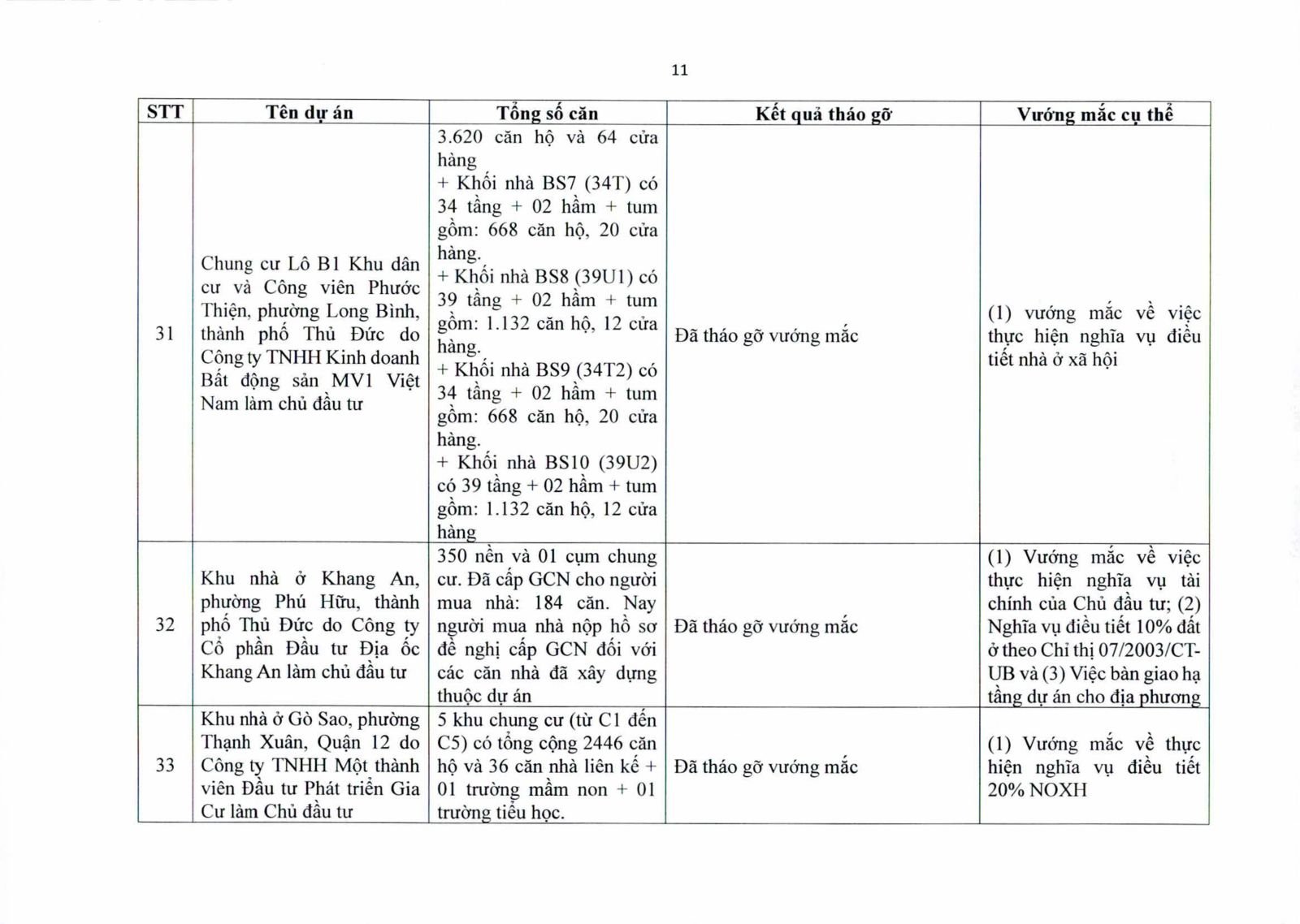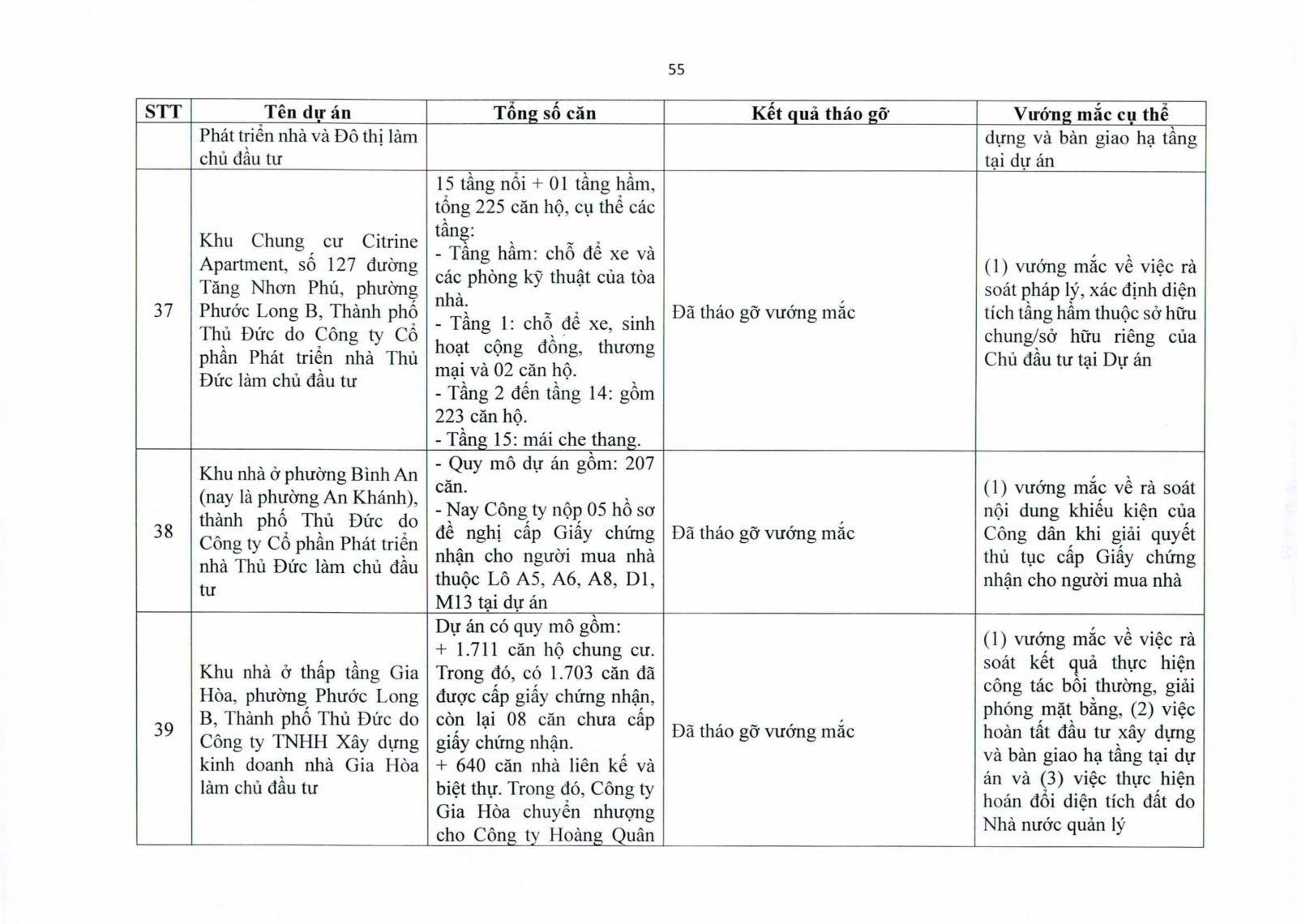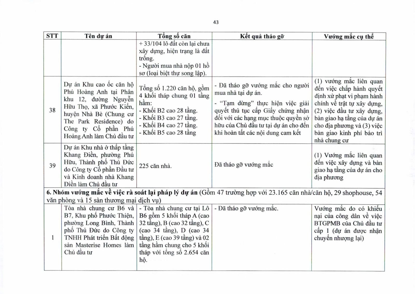 Một số dự án có diện tích đất công xen kẽ, đất giao thông, đất cây xanh chưa hoàn tất thủ tục chuyển đổi. Việc chưa xử lý dứt điểm quỹ đất này khiến hàng trăm căn hộ không thể được cấp giấy chứng nhận.