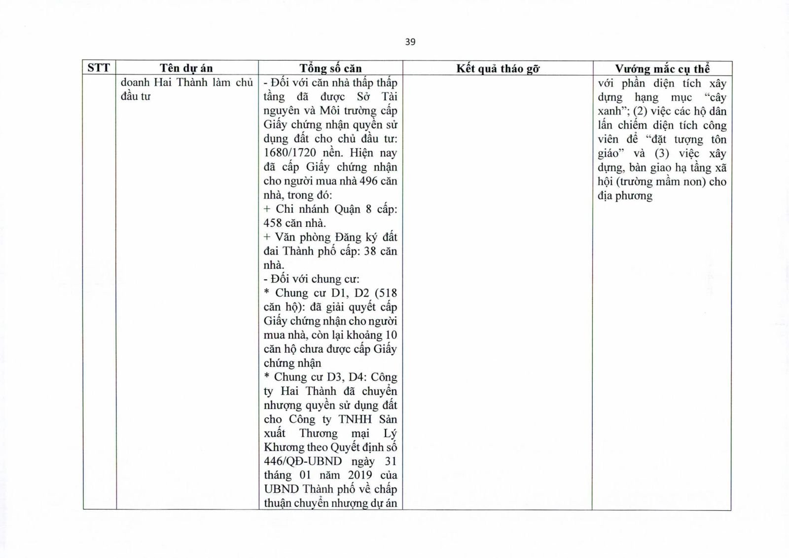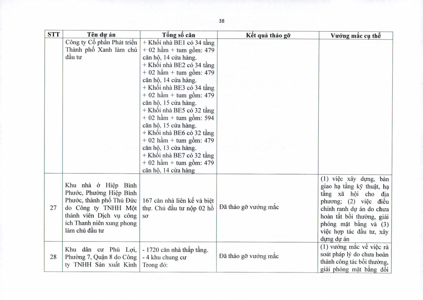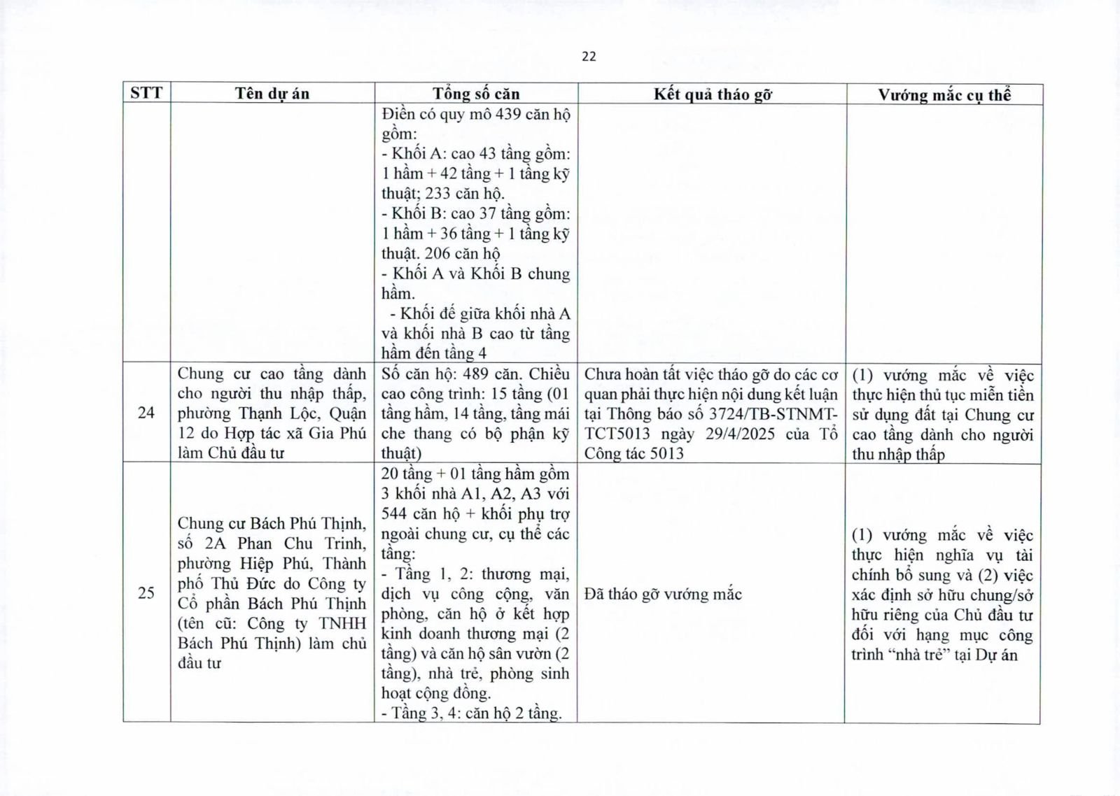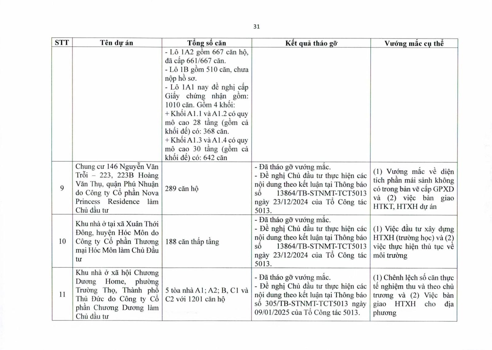 Một số dự án có diện tích đất công xen kẽ, đất giao thông, đất cây xanh chưa hoàn tất thủ tục chuyển đổi. Việc chưa xử lý dứt điểm quỹ đất này khiến hàng trăm căn hộ không thể được cấp giấy chứng nhận.