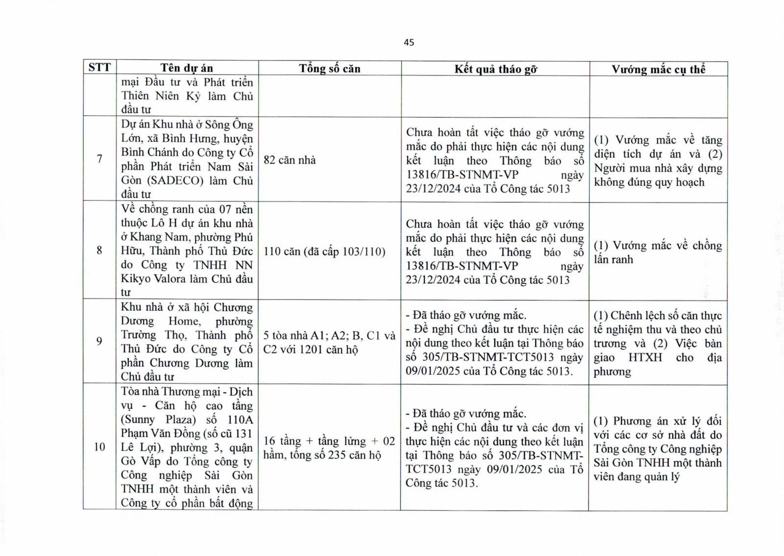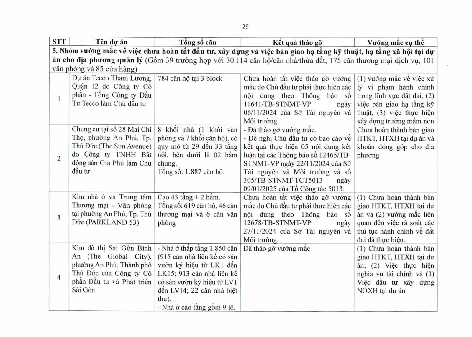 Sở TN&MT TP.HCM cho biết đang phối hợp với Sở Xây dựng, Sở Quy hoạch – Kiến trúc và UBND các quận, huyện rà soát từng dự án, phân loại hồ sơ để tập trung tháo gỡ. Thành phố sẽ kiên quyết xử lý các chủ đầu tư chậm trễ nghĩa vụ tài chính, đồng thời tăng cường công khai danh sách các dự án đủ và chưa đủ điều kiện cấp giấy chứng nhận để người dân nắm rõ.